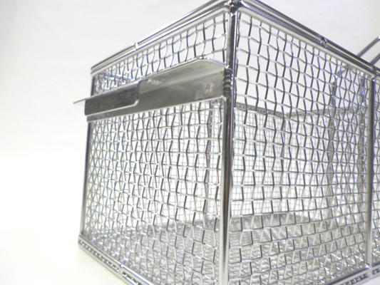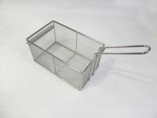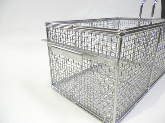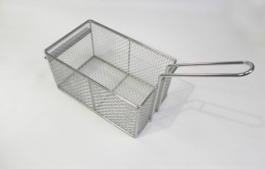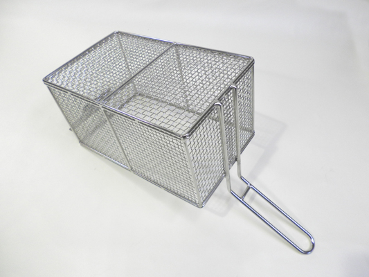 ポテトフライ、コロッケなどを揚げるためのカゴ。 前面フック部を針金でなくアングル仕上げにしているので、大変丈夫です。 フライヤーの油槽の寸法にあわせた別注製作も可能です。