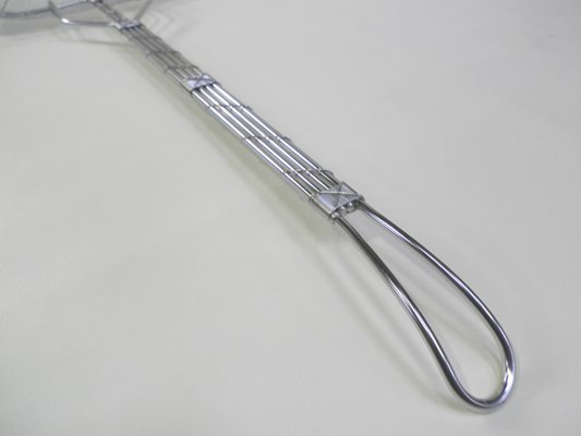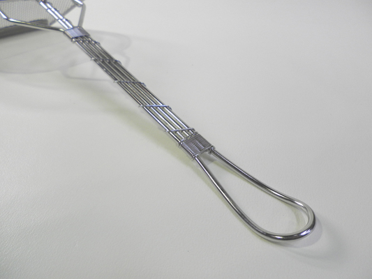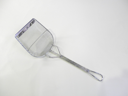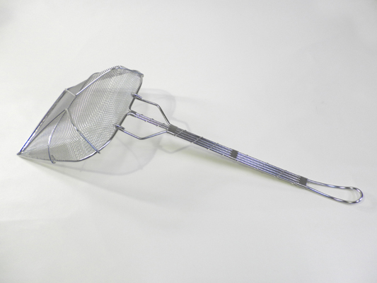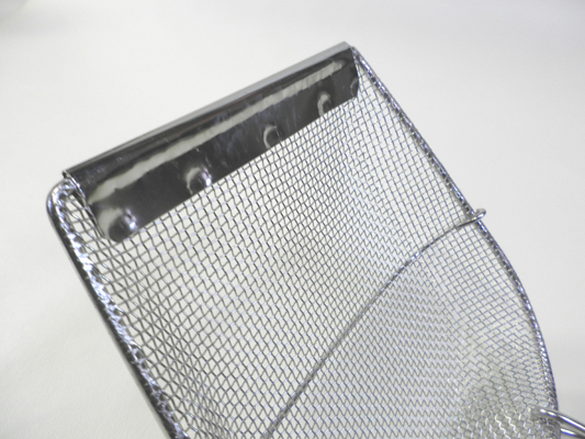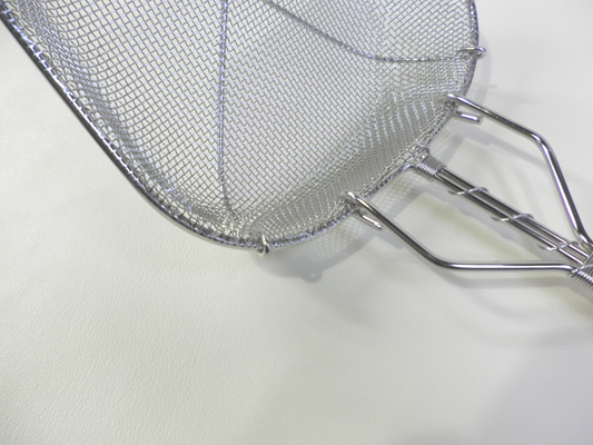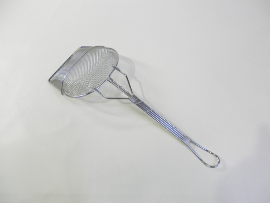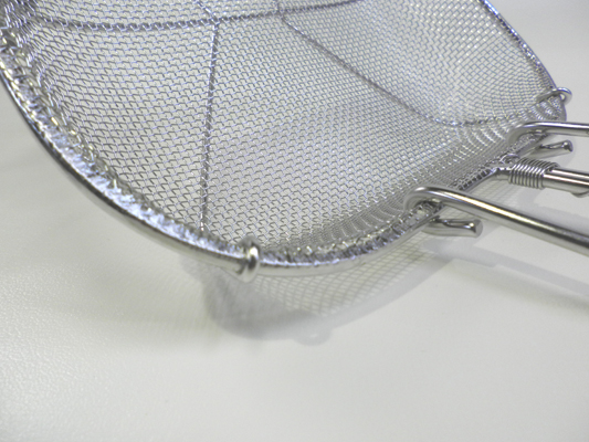 揚げ物調理用のすくい網です。 一般的な形状ではありますが、 網部と枠の溶接を通常の3倍も施し 強度を高め、耐久性をあげています。 *12メッシュ=約2mm目
